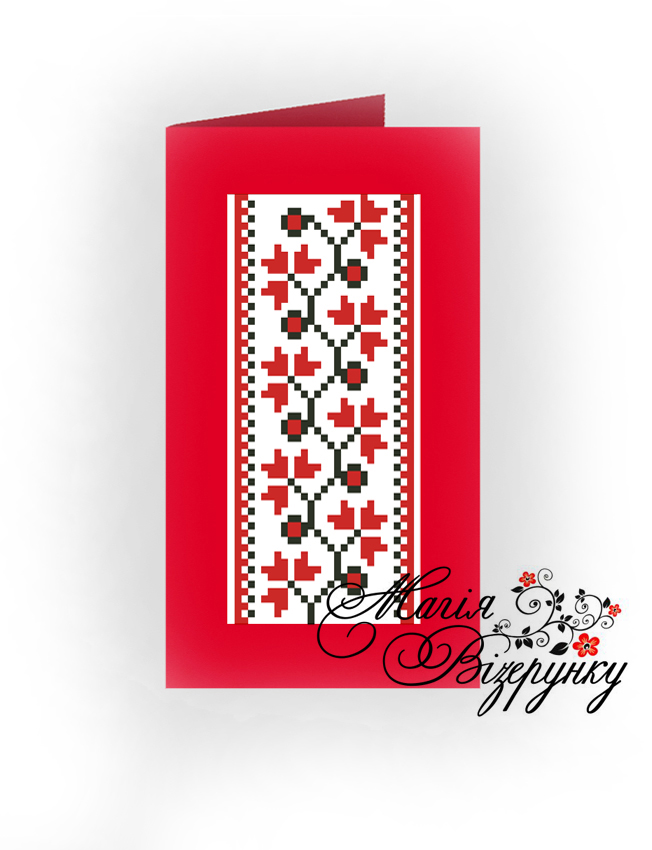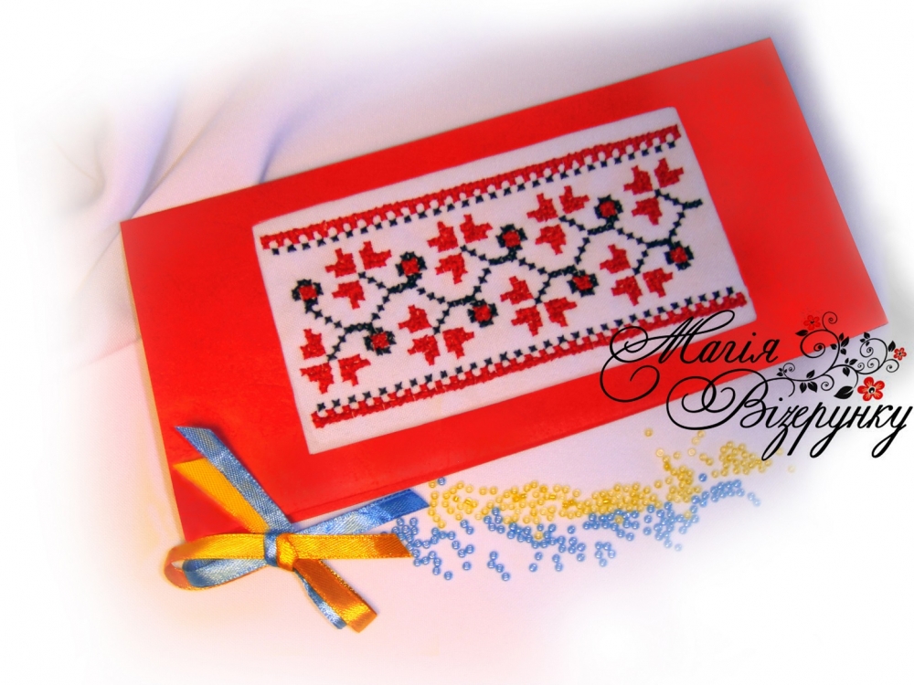 До комплекту входить паперова заготовка та полотно з нанесеною кольоровою схемою для вишивки. Полотно з нанесеною схемою вишивайте бісером №10 або нитками. Виріжте канцелярським ножем під лінійку проріз по пунктирній лінії на паперовій заготовці для вишитого полотна. Приклейте вишиту Вами заготовку до паперу та складіть листівку.