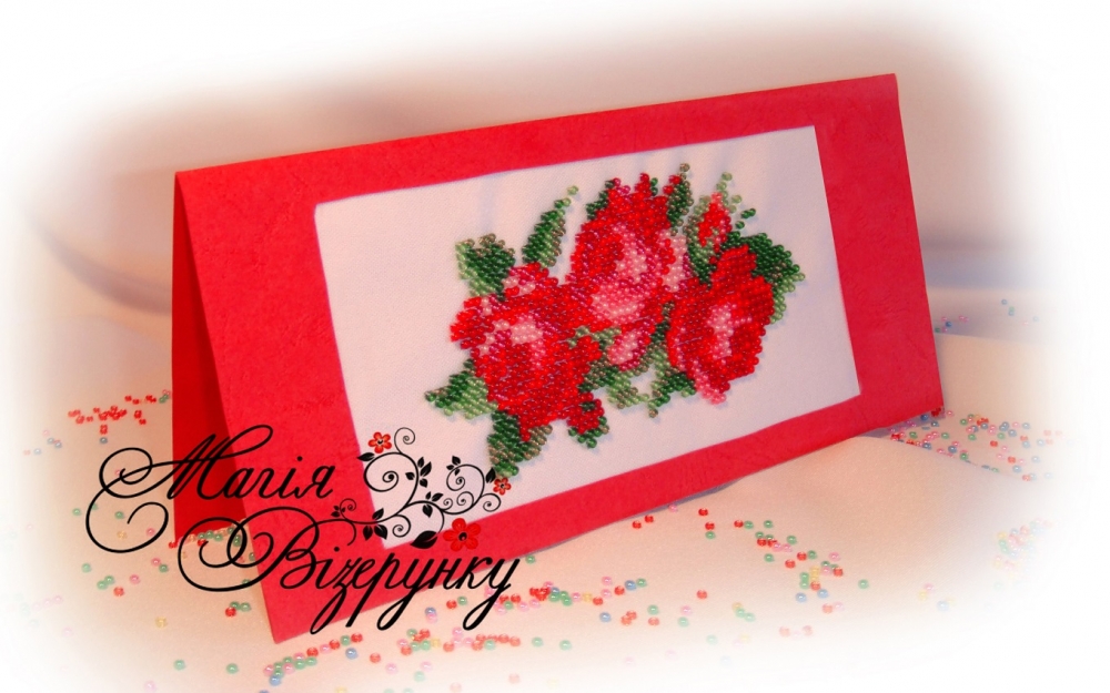 До комплекту входить паперова заготовка та полотно з нанесеною кольоровою схемою для вишивки. Полотно з нанесеною схемою  вишивайте бісером №10 або нитками. Виріжте канцелярським ножем під лінійку проріз по пунктирній лінії на паперовій заготовці для вишитого полотна. Приклейте вишиту Вами заготовку  до паперу та складіть листівку.