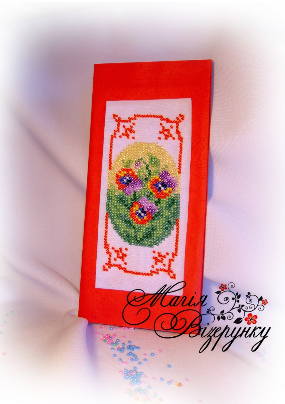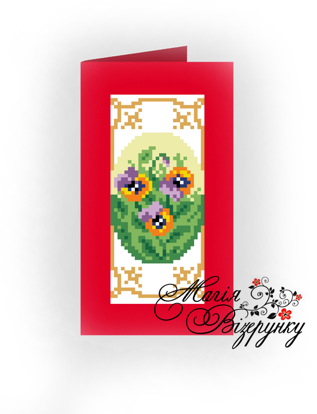 До комплекту входить паперова заготовка та полотно з нанесеною кольоровою схемою для вишивки. Полотно з нанесеною схемою  вишивайте бісером №10 або нитками. Виріжте канцелярським ножем під лінійку проріз по пунктирній лінії на паперовій заготовці для вишитого полотна. Приклейте вишиту Вами заготовку  до паперу та складіть листівку.