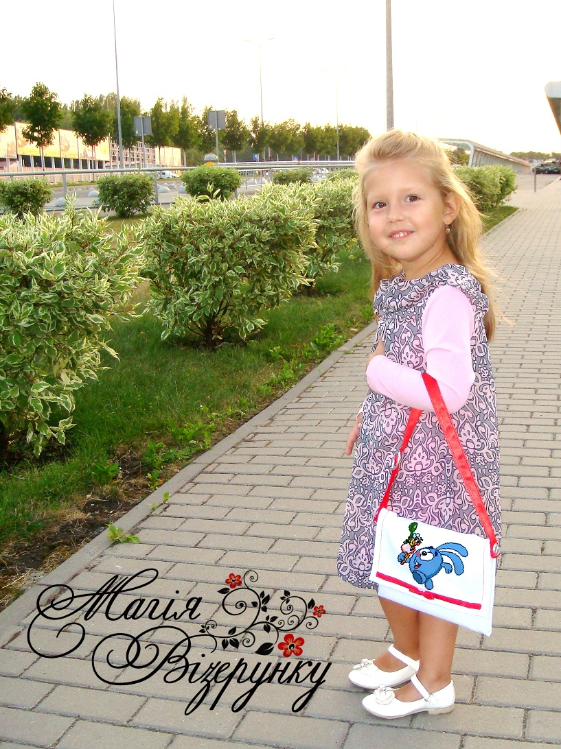 Тканина       для вишивки     дитячої      сумочки     бісером,    нитками або в  змішаній техніці  з нанесеною повно колірною схемою на габардині проклеєному флізеліном. В  комплект    входить    інструкція   в    якій     вказано   кольори   бісеру   і  його    кількість,  рекомендовані  номери   ниток   DMC. Краї   сумочки не   оброблені. Сумочка не пошита.