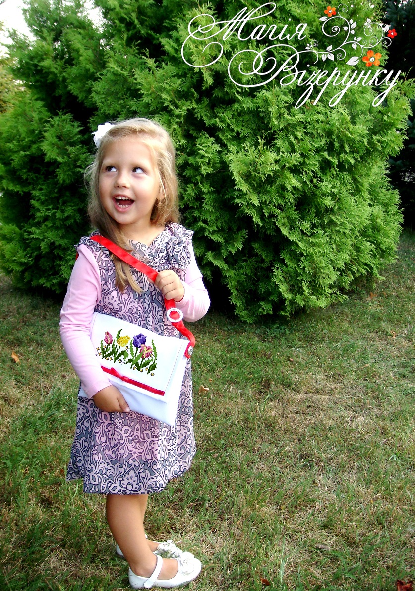 Тканина       для вишивки     дитячої      сумочки     бісером,    нитками або в  змішаній техніці  з нанесеною повно колірною схемою на габардині проклеєному флізеліном. В  комплект    входить    інструкція   в    якій     вказано   кольори   бісеру   і  його    кількість,  рекомендовані  номери   ниток   DMC. Краї   сумочки не   оброблені. Сумочка не пошита.