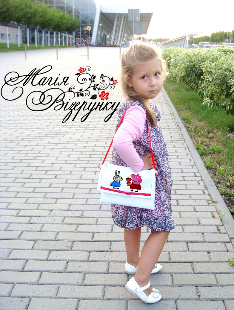 Тканина для вишивки дитячої сумочки бісером, нитками або в змішаній техніці з нанесеною повно колірною схемою на габардині проклеєному флізеліном. В комплект входить інструкція в якій вказано кольори бісеру і його кількість, рекомендовані номери ниток DMC. Краї сумочки не оброблені. Сумочка не пошита.