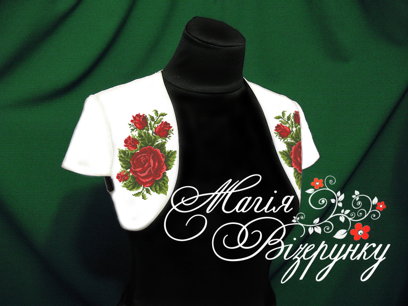 Жіноче болеро для вишивки бісером, нитками або в змішаній техніці з нанесеною повно колірною схемою на тканині. Заготовка складається з двох полотен 40 * 50 см на передню частину, на спинку 70*50 см (без вишивки) та флізеліну. В комплект входить інструкція в якій вказано кольори бісеру і його кількість, рекомендовані номери ниток DMC.
