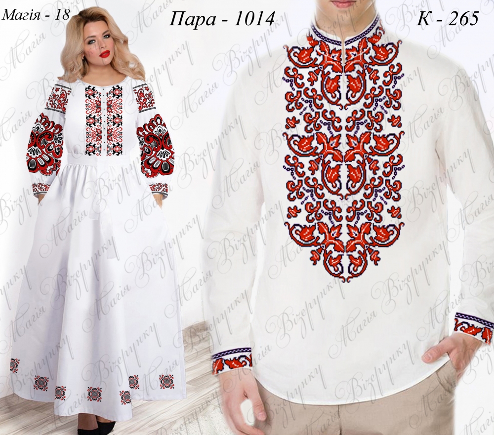 Тканина для вишивки бісером, нитками або в змішаній техніці з нанесеною повноколірною схемою . В комплект входить два відрізи тканини 50*60 см на перед і спинку, два відрізи 75*60см на рукави, 150*30см пояс, спідниця 210*100см, манжети, інструкція в якій вказані кольори бісеру і його кількість, рекомендовані номери ниток DMC. На спідницю пришивається мереживо (горизонтально дві полоси,вертикально шість які до комплекту не входять).