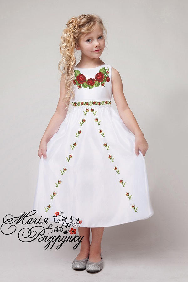 Тканина для вишивки бісером, нитками або в змішаній техніці з нанесеною             повноколірною схемою на габардині.  Заготовка складається з двох полотен 40*50см (перед/спинка), два полотна 60*75см(спідничка) та окремого довгого пояска 20*150см,    який      зав′язується гарним бантом зі спинки платтячка . В комплект  входить    інструкція в  якій  вказано кольори   бісеру   і його кількість, рекомендовані номери  ниток DMC.