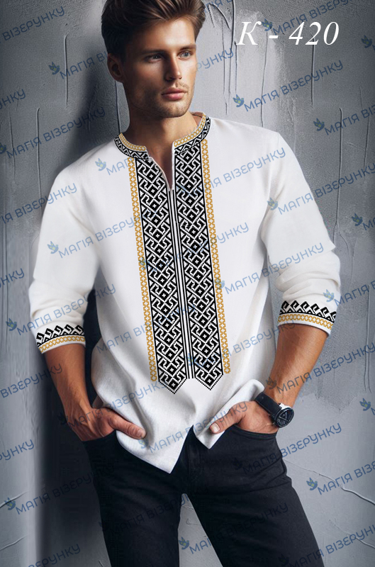 Тканина для вишивки нитками, бісером з нанесеною повно колірною схемою  . В  комплект   входить чотири відрізи тканини  75*80см з друком на передню частину та окремого полота з друком  манжетів і  комірця,  інструкція   в  якій  вказано   кольори  бісеру  і  його кількість  та   рекомендовані  номери ниток DMC.   Дану  заготовку  ви  можете  скроїти  за  своїми  розмірами  та  фасоном. Перед  вишивкою потрібно  зробити розмітку горловини та обробити розріз (петлевим швом ,можна вставити замочок чи ін.).