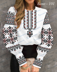 Жіноча сорочка для вишивки бісером, нитками або в змішаній техніці з нанесеною повноколірною схемою на тканині. Заготовка складається з двох полотен 75*75см на передню частину і на спинку (без вишивки) та двох полотен 75*75 см на рукави, відрізу тканини на манжети та комір. В комплект входить інструкція в якій вказано кольори бісеру і його кількість, рекомендовані номери ниток DMC.  Дану заготовку ви можете скроїти за своїми розмірами та фасоном.
