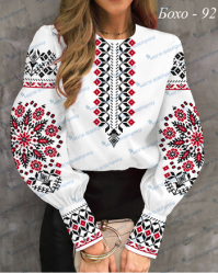 Жіноча сорочка для вишивки бісером, нитками або в змішаній техніці з нанесеною повноколірною схемою на тканині. Заготовка складається з двох полотен 75*75см на передню частину і на спинку (без вишивки) та двох полотен 75*75 см на рукави, відрізу тканини на манжети та комір. В комплект входить інструкція в якій вказано кольори бісеру і його кількість, рекомендовані номери ниток DMC.  Дану заготовку ви можете скроїти за своїми розмірами та фасоном.