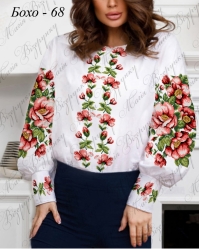 Жіноча сорочка для вишивки бісером, нитками або в змішаній техніці з нанесеною повноколірною схемою на тканині. Заготовка складається з двох полотен 75*75см на передню частину і на спинку (без вишивки) та двох полотен 75*75 см на рукави, відрізу тканини на манжети та комір. В комплект входить інструкція в якій вказано кольори бісеру і його кількість, рекомендовані номери ниток DMC.  Дану заготовку ви можете скроїти за своїми розмірами та фасоном.